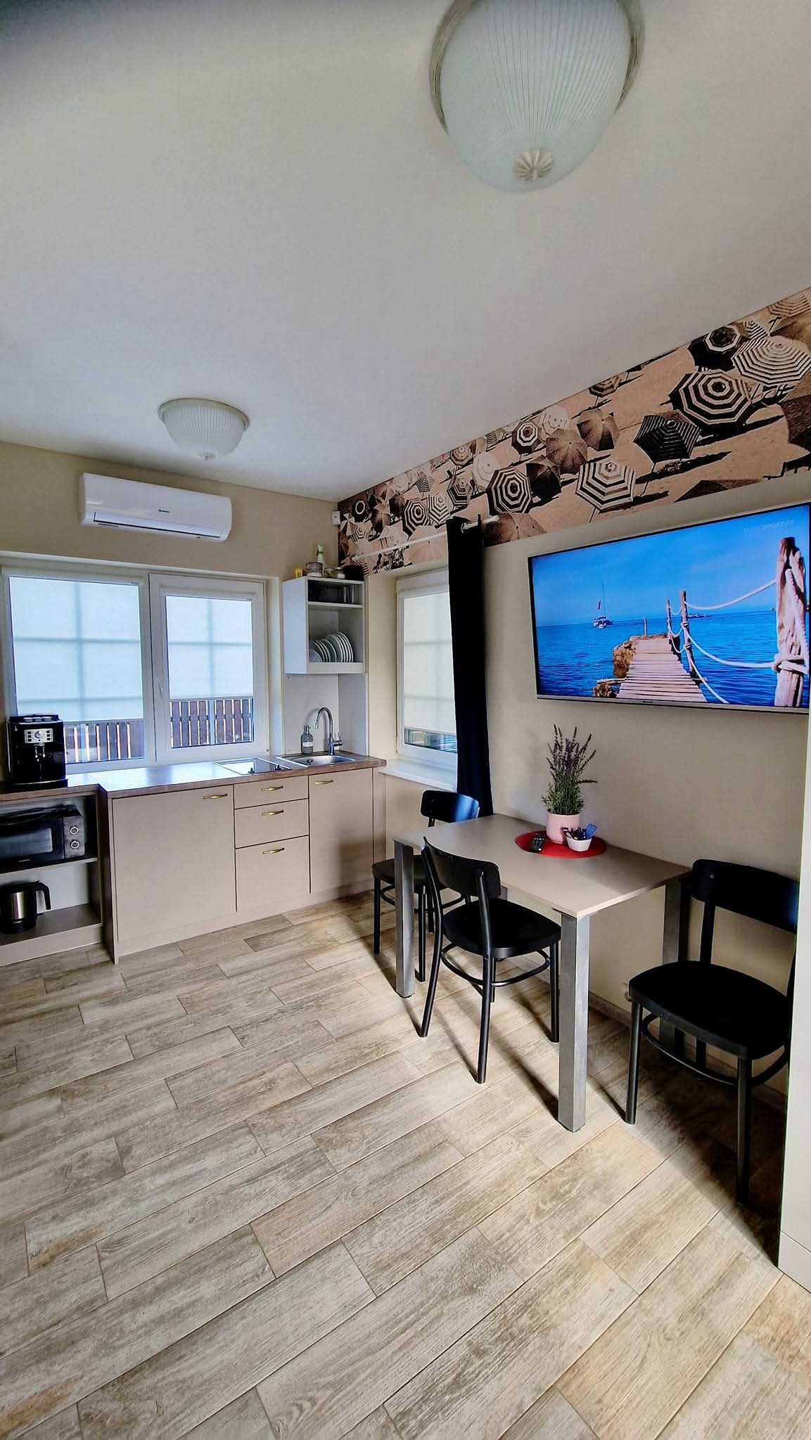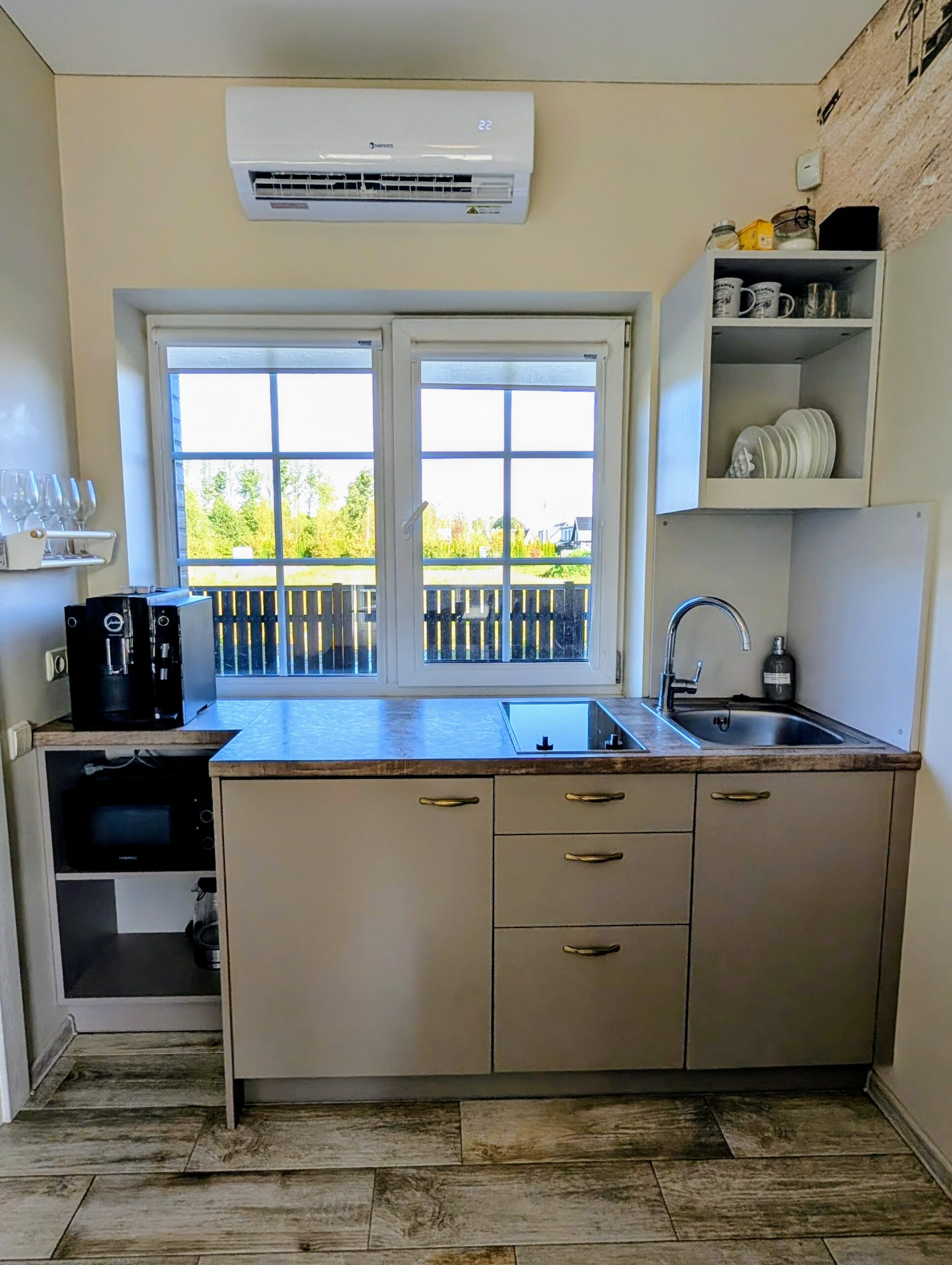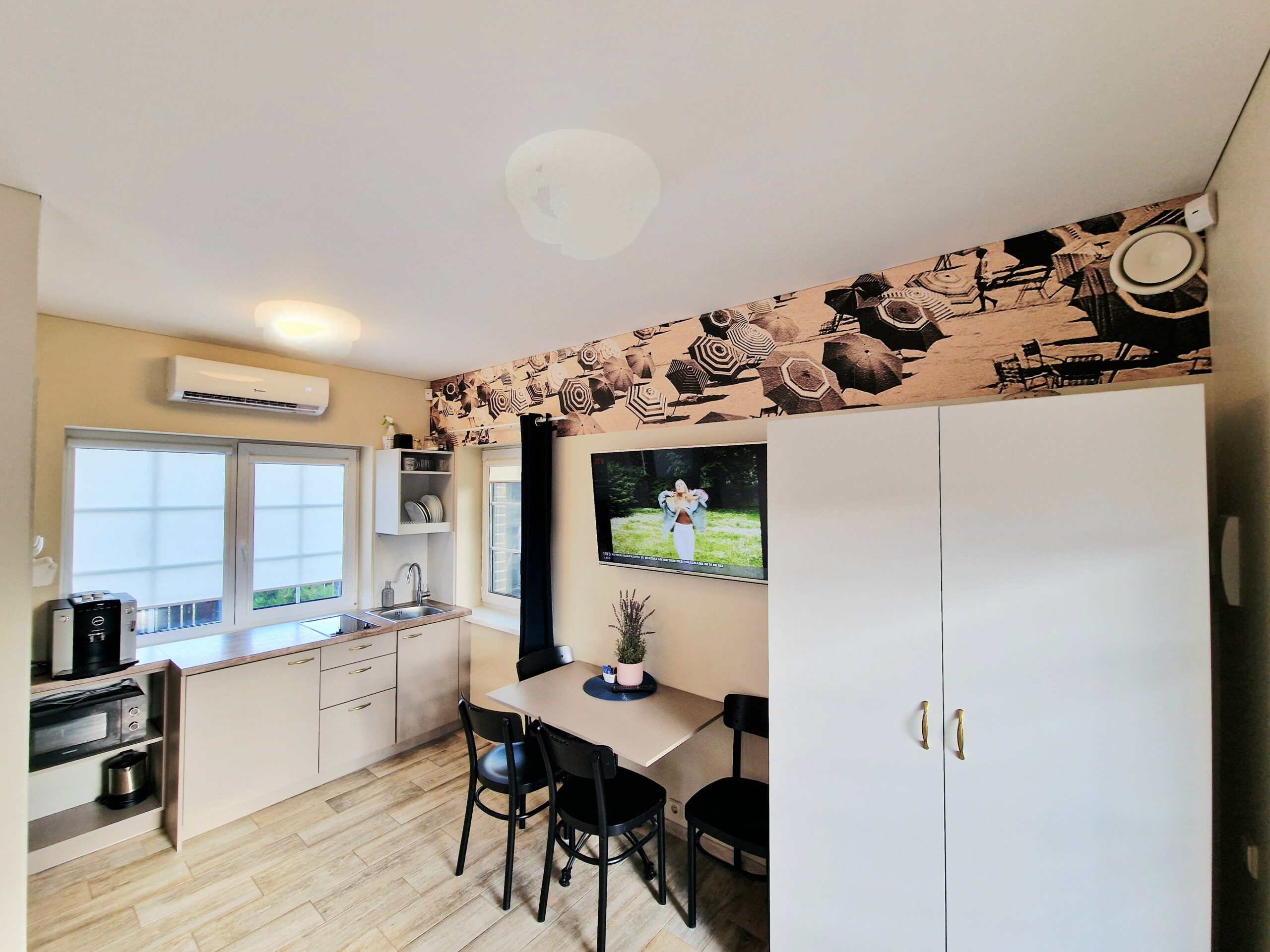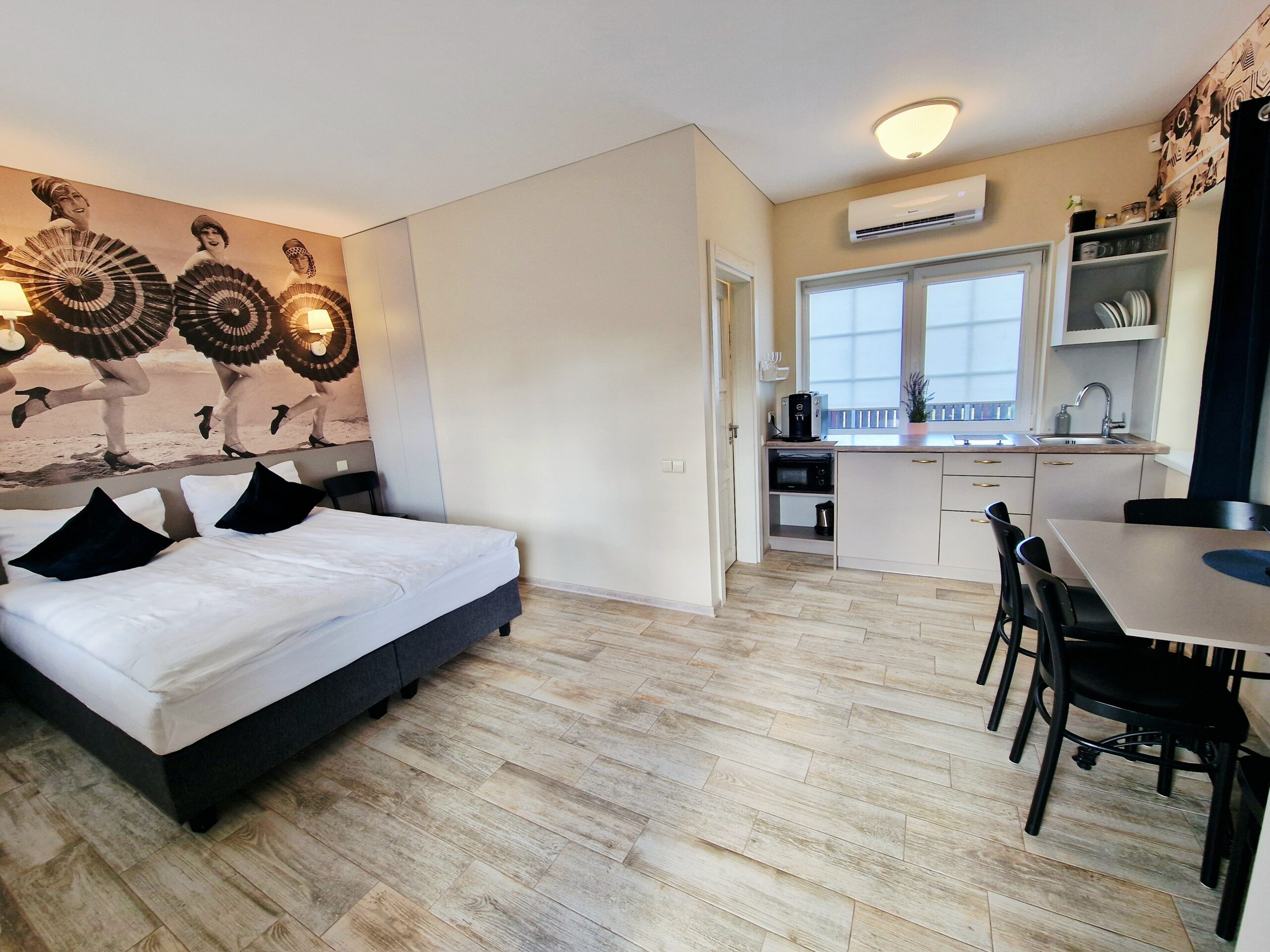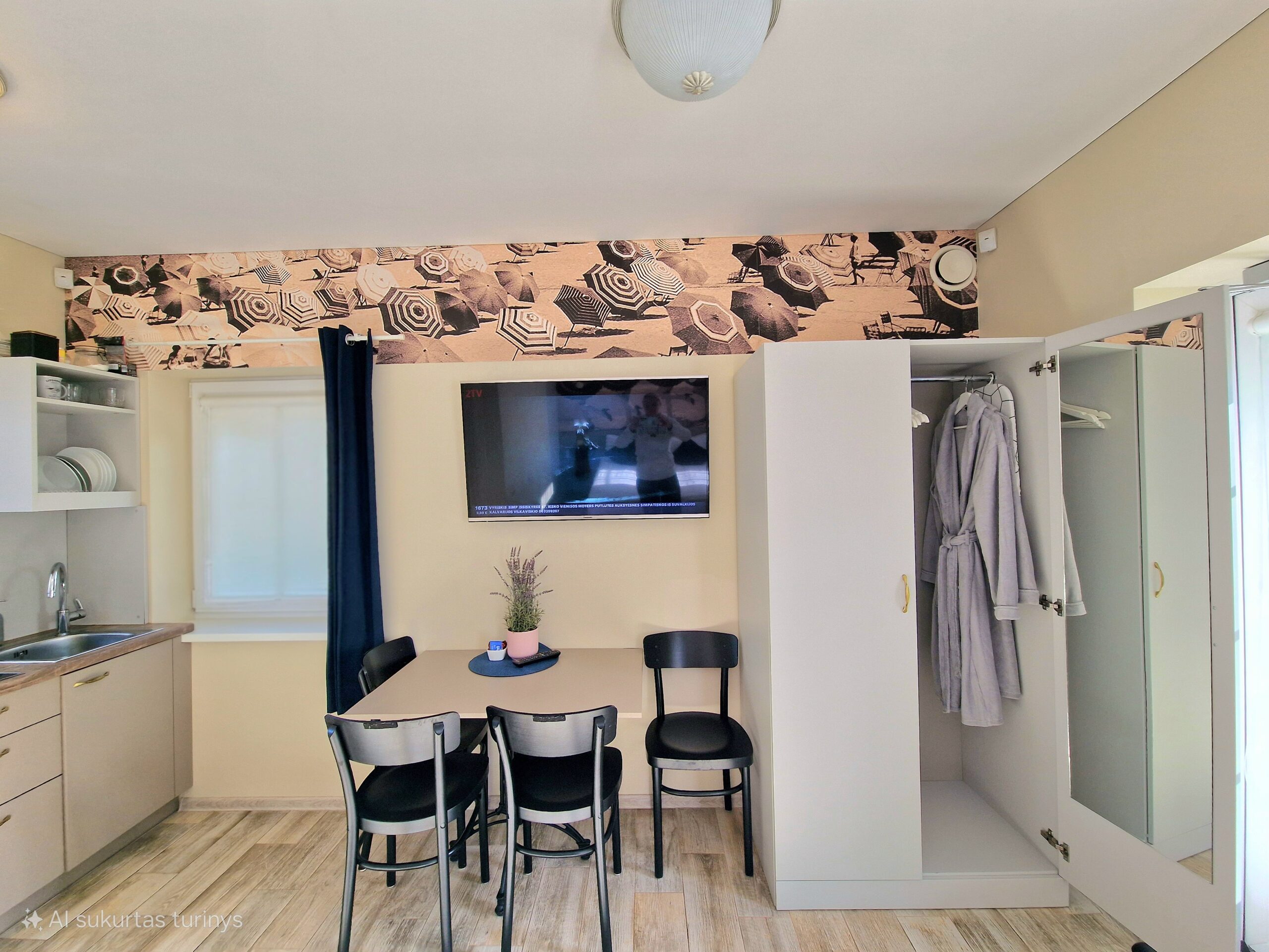 Studijos apartamentai yra aprūpinti oro kondicionieriumi, patogiausia ilsėtis dviem asmenims, taip pat šeimai su vaiku iki 3 metų už papildomą mokestį. Patogi dvigulė lova, spinta rūbams, valgomojo vieta, patogi virtuvė. Studijos interjeras yra stilizuotas, teminis ir atspindi pramogas, veiklas, emocijas, be kurių vasara pajūryje yra neįsivaizduojama. Kompaktiški, garsui nepralaidūs, moderniai įrengti 21 kv. m. studijos apartamentai yra su atskiru įėjimu, turi lauko kiemelį/terasą, jame yra lauko baldai, kad patogiai galėtumėte sutikti Saulę su rytinės kavos puodeliu rankoje . Jums nereikia rūpintis namų apyvokos daiktais – juos visus rasite čia, viskas iki menkiausios smulkmenos yra apgalvota mūsų dizainerio. Naujai įrengta virtuvė su visa reikalinga įranga, įrankiais, rankšluosčiais ir WC su dušu – viskas poilsiautojų patogumui. Jums reikės pasiimti tik asmens higienos daiktus, reikmenis paplūdimiui ir… gerą nuotaiką.