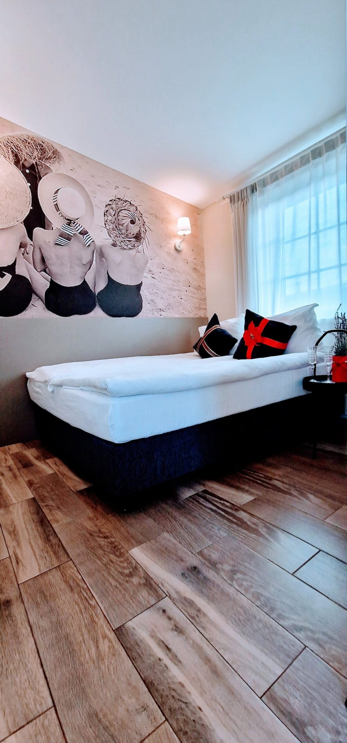 Vieno miegamojo apartamentai su oro kondicionieriumi yra skirti šeimoms iki 4 asmenų. Juos sudaro dvi erdvės: atskira miegamojo erdvė ir poilsio erdvė su mini virtuve. Abiejų erdvių interjeras yra stilizuotas, teminis ir atspindi pramogas, veiklas, emocijas, be kurių vasara pajūryje yra neįsivaizduojama. Kompaktiški, garsui nepralaidūs, moderniai įrengti 21 kv. m. vieno miegamojo apartamentai yra antrame aukšte, su atskiru įėjimu, turi balkoną, jame yra lauko baldai, kad patogiai galėtumėte sutikti Saulę su rytinės kavos puodeliu rankoje. Kiekviename vieno miegamojo apartamente yra dvigulė lova bei išskleidžiama lova-kampas vaikams. Jums nereikia rūpintis namų apyvokos daiktais – juos visus rasite čia, viskas iki menkiausios smulkmenos yra apgalvota mūsų dizainerio. Naujai įrengta virtuvė su visa reikalinga įranga, įrankiais, rankšluosčiais ir WC su dušu – viskas poilsiautojų patogumui. Jums reikės pasiimti tik asmens higienos daiktus, reikmenis paplūdimiui ir… gerą nuotaiką.